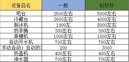 开奶茶店都需要设备,全套设备多少钱呢,我们先来看看,一个奶茶店的基本标配有哪些设备(此处以标准店为例)。清单如下: 奶茶设备包括了水吧台冷藏台,制冰机,奶茶桶,果糖机,自动开水机,封口机(手动)自动的两款,奶盖机,净水器,好一点设备,水吧台5000左右,冷藏台,制冰机,奶茶桶,果糖机,蒸汽泡奶机,自动开水机,自动封口机,奶盖机,净水器。设备价格根据市场而定质量好的会稍贵些。为您列了个价格清单,详细参阅:
